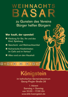 Am ersten Adventswochenende laden wir wieder ganz herzlich zu unserem Weihnachtsbasar im Katholischen Gemeindezentrum in der Georg-Pingler-Straße 26, Königstein ein. Am Samstag, 29. November, und Sonntag, 30. November, freuen wir uns von 10 bis 17 Uhr über viele Besucherinnen und Besucher.
