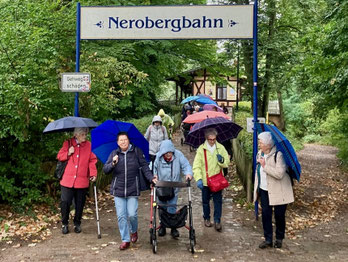 Trotz des regnerischen Wetters herrschte beste Stimmung. Ziel war der Neroberg, den die Gruppe mit der historischen Nerobergbahn erklomm. Diese seit 1888 in Betrieb befindliche Wasserballastbahn, heute ein technisches Denkmal, beförderte klaglos alle Mitfahrenden – auch mit Rollatoren und Rollstuhl. So wurde der Ausflug trotz der Regengüsse zu einem besonderen und unvergesslichen Erlebnis.
